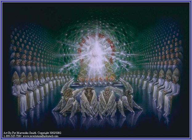 Four unusual creatures were hovering about the throne, each with six wings and with eyes on all sides of their bodies: